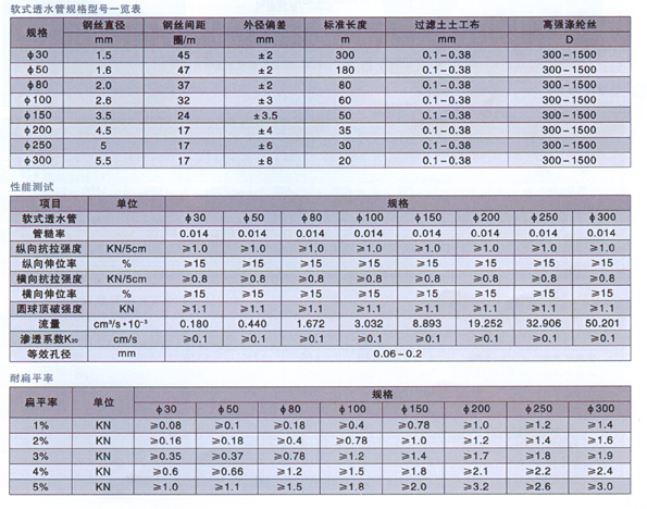 鋼絲由PVC過塑成框架結構的軟式透水管。它們具有通過整體的周身全方位過濾并快速有效排除地下水,滲透率高,排水量大,取代傳統的聚氯乙烯打孔管滲水。使用方便,功效高等優點。