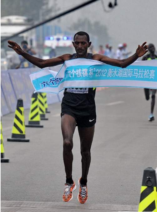 【#衡水湖國(guó)際馬拉松賽# 沖過(guò)終點(diǎn)】9月22日,埃塞俄比亞選手梅孔嫩在比賽中沖過(guò)終點(diǎn)。當(dāng)日,在河北省衡水市舉行的2012年衡水湖國(guó)際馬拉松比賽中,埃塞俄比亞選手梅孔嫩以2小時(shí)08分07秒的成績(jī)奪得男子組冠軍。 新華社記者楊世堯攝