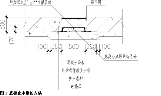 在混凝土墊層上沿兩條止水帶外側向外擴展各200mm ,其間粘貼3mm 厚的三元乙丙橡膠防水卷材或氯丁橡膠片(粘貼于墊層之上,要牢固),然后再將橡膠止水帶與其用401 防水膠粘貼牢固,如圖3 所示。